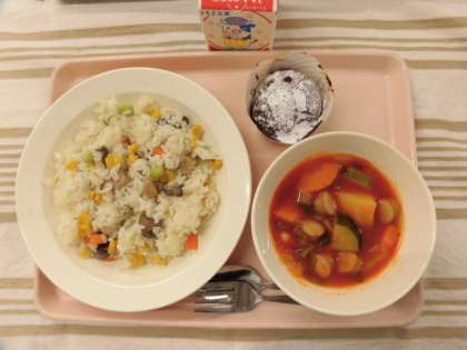 三色ピラフ 夏野菜のトマト煮 米粉のココアマフィン 牛乳