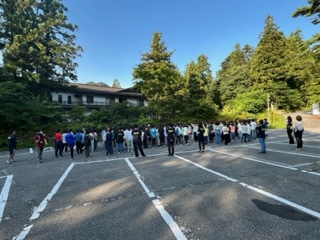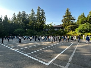 二つの宿舎の間にある駐車場で朝会を行いました。