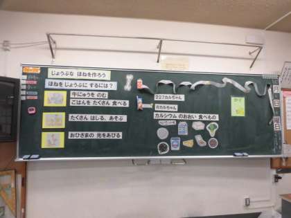 栄養士と担任がティームティーチングで、食育の授業「じょうぶな骨を作ろう」を行いました。