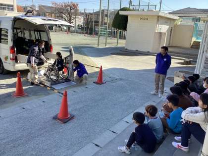 総合の「思いやりの輪を広げよう」の一環で、車椅子体験と車椅子で生活をしている方々のお話を伺う活動を行いました。