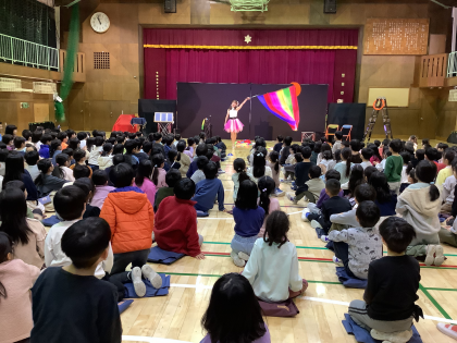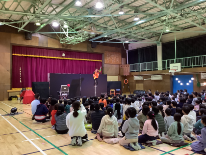 「笑顔と学びの体験活動プロジェクト」として、ムーラさんのサーカス芸と、ミーナさんのマジックを1、2年生、六組が鑑賞しました。