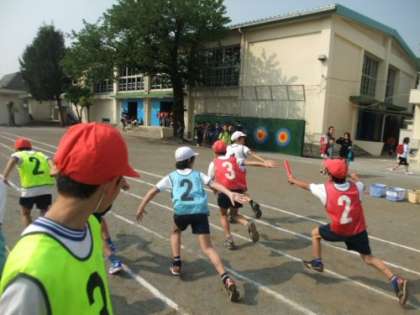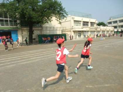 校庭ではリレーの選手たちが練習をしています。体育館では