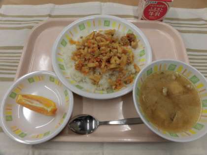 高野豆腐のそぼろ丼 豚汁 デコポン 牛乳
