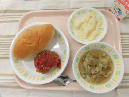 ミルクパン お野菜いっぱいハンバーグ キャベツのスープ 牛乳