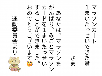 今年度は、マラソンカードを1枚終わらせた児童には、運動委員会から表彰状が貰えます。