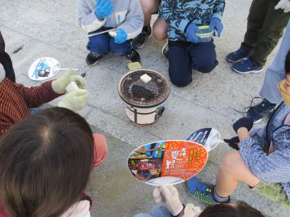 七輪の使い方を学び、もちを焼きました。