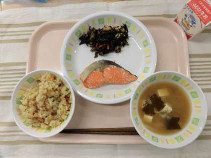鶏ごぼうごはん 鮭の塩焼き 豆腐とわかめの味噌汁 ひじきの炒め煮 牛乳