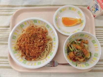 スパゲッティミートソース パリパリサラダ デコポン 牛乳
