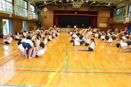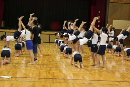 組体操の練習をしていました。4時間目は5年生が「棒倒し」の練習です。