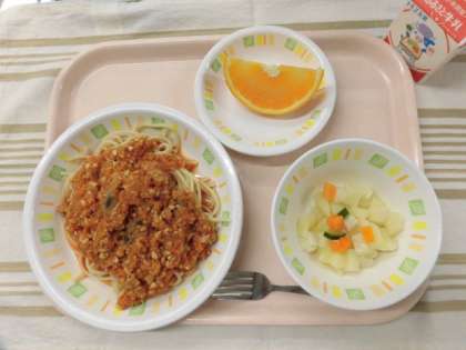 スパゲッティミートソース 新じゃが芋のサラダ 清見オレンジ 牛乳