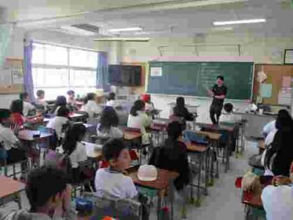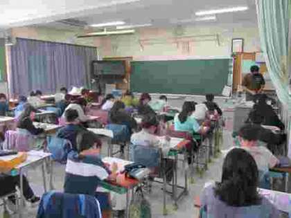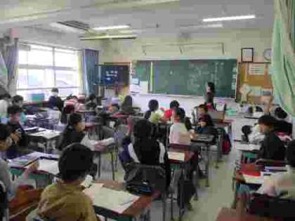 5年生は活発に話し合い活動をしていたり、静かにテストに取り組んだり、国語で春のキーワードを出し合っていました。