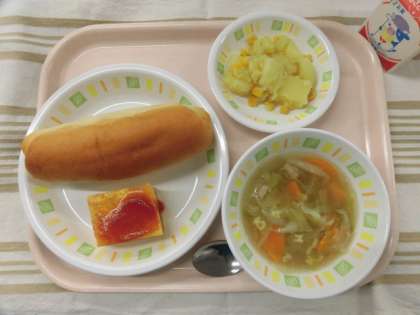 ミルクパン チーズ入りオムレツ ABCスープ カレーポテト 牛乳