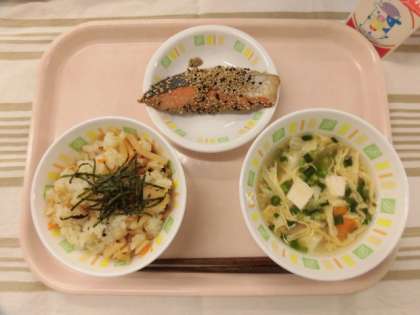 たけのこ寿司 鮭の南部焼き かきたま汁 牛乳