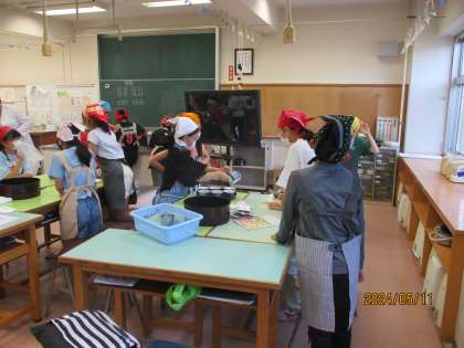 5年生は家庭科でお茶をいれる調理実習をしたり、教室で校外学習で行った高尾山について報告会をしていました。