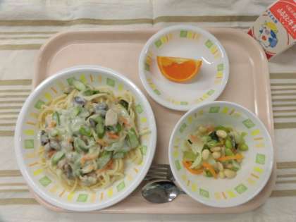 アスパラガスのホワイトソーススパゲッティ ビーンズサラダ カラマンダリン 牛乳