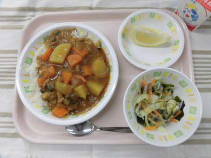チキンカレーライス わかめサラダ ニューサマーオレンジ 牛乳