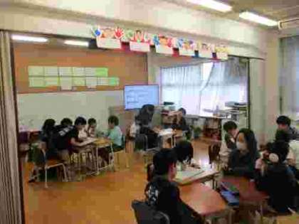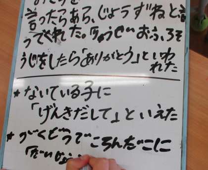 六組の教室では、道徳の学習をしていました。ありがとうと言われた場面について、グループで発表しあっていました。
