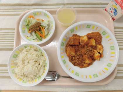 胚芽米ご飯 生揚げの四川煮 中華サラダ りんごゼリー 牛乳
