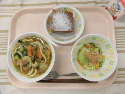 カレーうどん キャベツのツナ和え ココアケーキ 牛乳