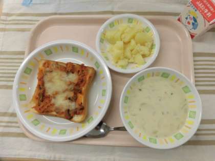 ピザトースト コーンポタージュ 粉吹芋 牛乳
