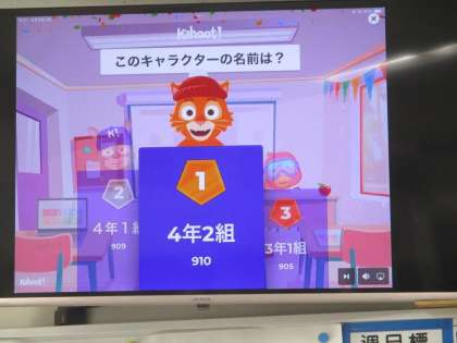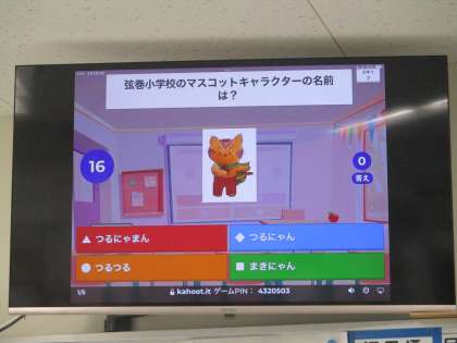 今朝の集会はテレビ放送で、タブレット端末のアプリ(kahoot)を使って弦巻小学校に関するクイズ大会をしました。「弦巻小学校のキャラクターの名前は?」「クラスの数は?」などの問題について、各クラスで答えを考えてアプリで送ります。