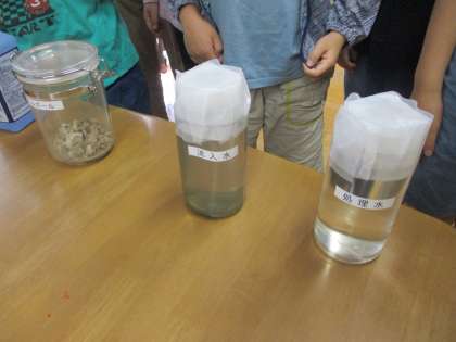 何も処理していない水と処理した水を比べて、特徴を探したり、どのように処理していくかお話を聞いたりしました。