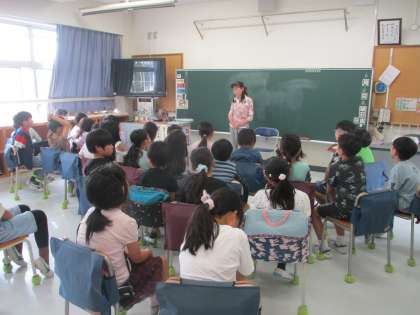 3年生の教室では、語り手の先生をお招きして素話をお聞きしました。日本の昔話や海外の話、絵本や誌なども交えて1時間、お話を聞きました。