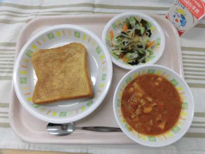 きなこ豆乳トースト ビーンズシチュー わかめサラダ 牛乳