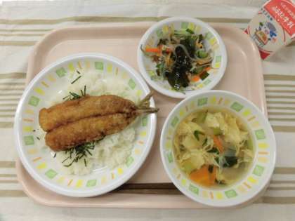 イワシのかば焼き丼 かきたま汁 梅ドレサラダ 牛乳