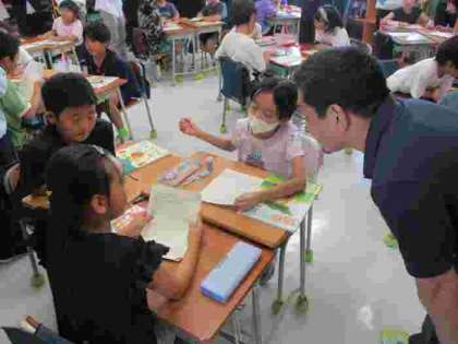 本年度、弦巻小学校では「伝え合い 学び合う 児童の育成」というテーマで校内研究を行っています。第1回目の研究授業として4年生が国語科で授業を行いました。絵本を読んで、どのようなポップや帯を作るかという学習で、それぞれの本のあらすじや気に入った場面などを友達と伝え合う学習を行いました。