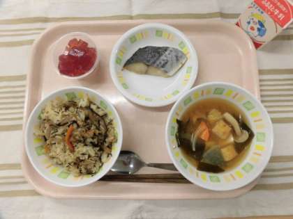 ひじきごはん サワラの塩こうじ焼き みそ汁 あじさいゼリー 牛乳