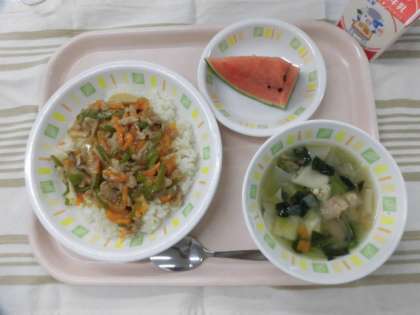 豚肉とピーマンの中華丼 ワンタンスープ 小玉すいか 牛乳