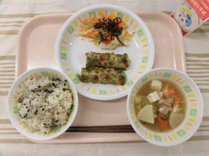 じゃこわかめごはん 竹輪の磯辺揚げ 豚汁 昆布サラダ 牛乳