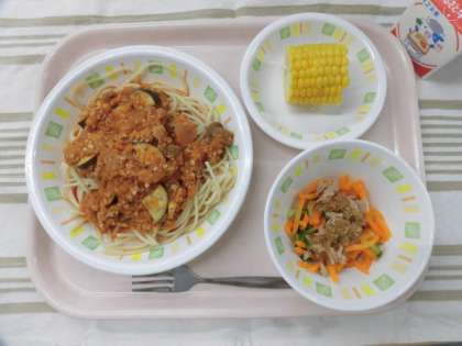 スパゲッティなすミートソース にんじんのラペ 蒸しとうもろこし 牛乳