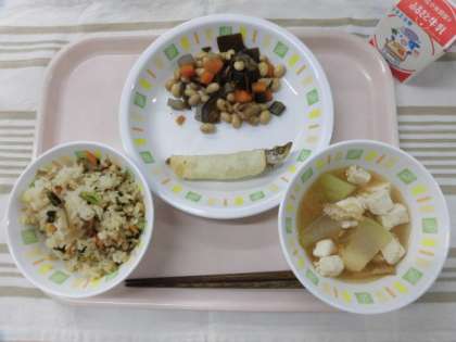 鶏ごぼうごはん シシャモのパリパリ揚げ 冬瓜のみそ汁 五目豆 牛乳