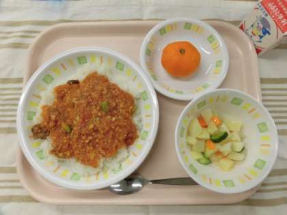 スパイシートマトライス じゃが芋サラダ 冷凍みかん 牛乳