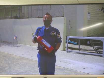 今回は、初期消火について学びということ、区から地域振興課の方をお招きして、消火器についてお話を聞きました。代表として先生が練習用の消火器で訓練を行い、その様子をテレビ放送で視聴しました。
