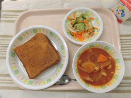 きなこバタートースト ビーンズシチュー フレンチサラダ 牛乳