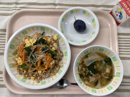 ツナと卵のそぼろごはん みそワンタンスープ プルーン 牛乳