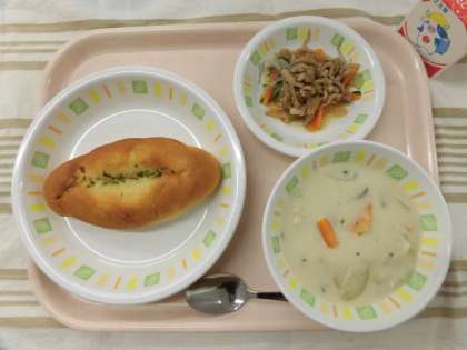 ガーリックトースト ホワイトシチュー スタミナサラダ 牛乳