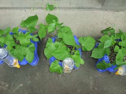 職員室の前には2年生の植えたサツマイモの苗が大きくなりました。
