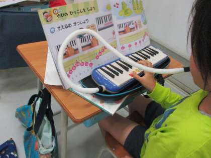 親指をつかう鍵盤を意識しながら、「かえるのがっしょう」を鍵盤ハーモニカで練習していました。