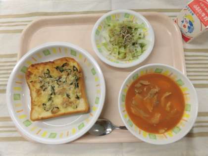 こまツナトースト 米粉のポークシチュー キャベツじゃこサラダ 牛乳