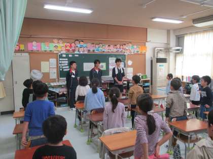 今日から3日間、同じ学び舎の弦巻中学校の2年生3名が小学校で職場体験を行っています。午前中は、学校主事の仕事を体験し、午後は各教室を回りました。