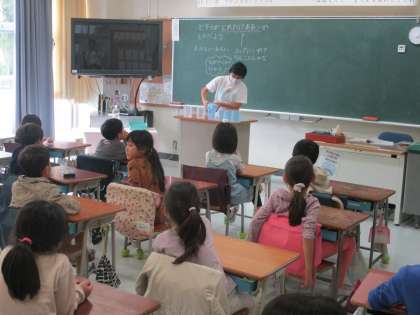 「どちらがどれだけ多いか調べよう」という学習で、教卓の上に置かれた2本のペットボトルに入っている水をどうしたら比べることができるか、みんな進んで考えて発言していました。