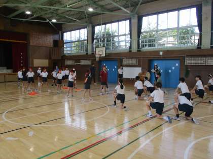 今日は体育館でエールの交換の仕方について確認をしていました。