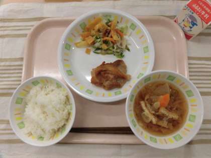 ごはん 鶏肉の照り焼き ねぎと油揚げのみそ汁 パリパリサラダ 牛乳