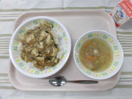 麻婆豆腐丼 ピリ辛中華スープ 牛乳