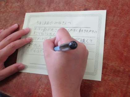 3年生の教室では、兄弟学級の5年生に向けて、運動会の感想のメッセージを書いていました。
