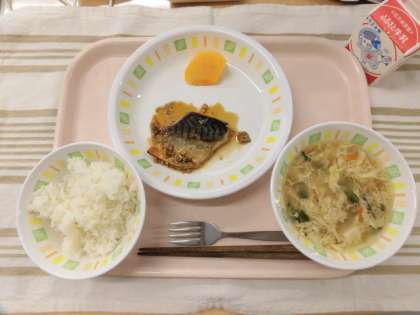 有機米のごはん 鯖のごまだれ焼き かきたま汁 柿 牛乳